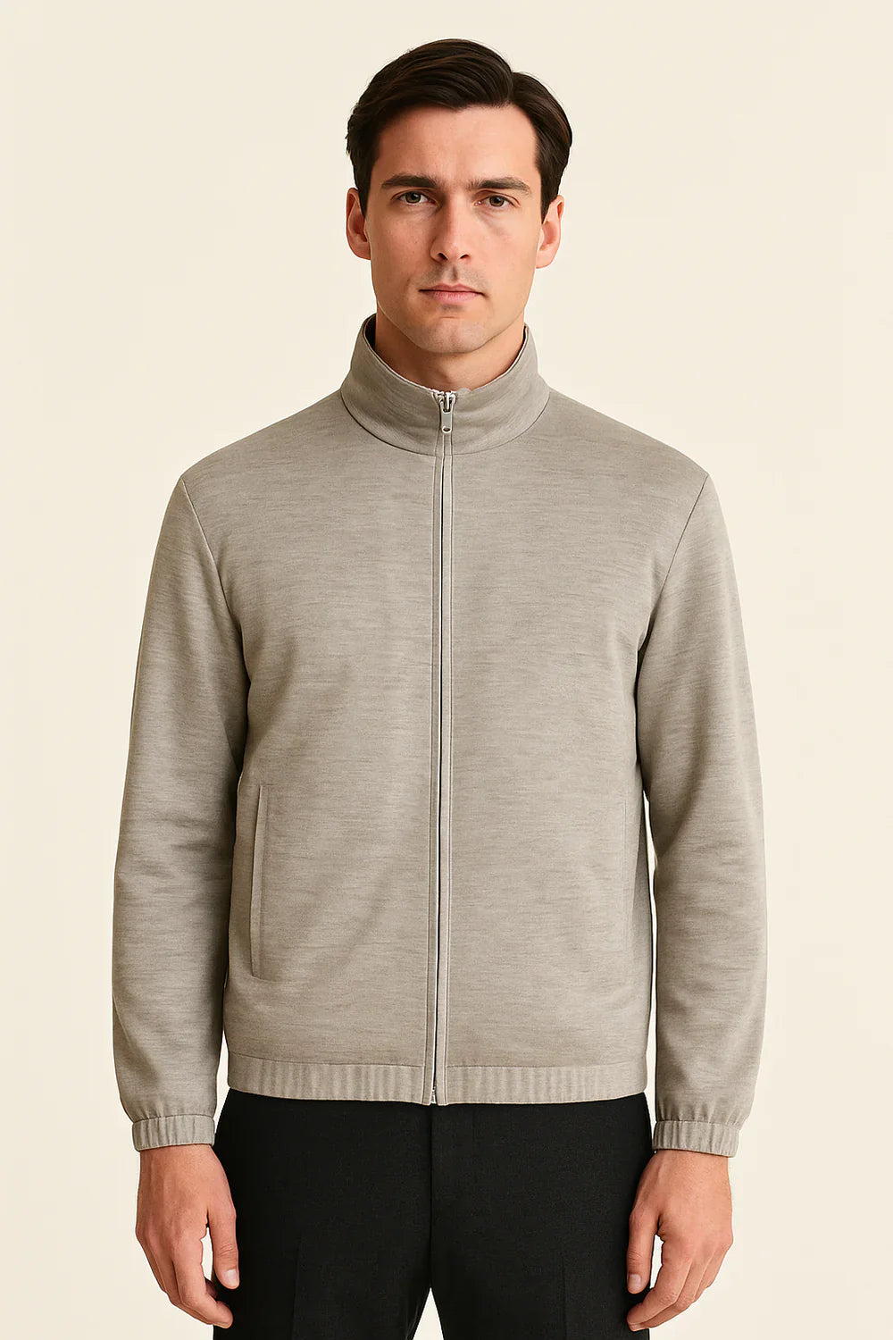 Una chaqueta bomber reversible modelada con precisión arquitectónica. La silueta es estructurada pero fluida, definida por líneas limpias, un cuello alto y proporciones equilibradas. Cada lado revela un tono distinto, ofreciendo versatilidad compuesta y facilidad refinada.