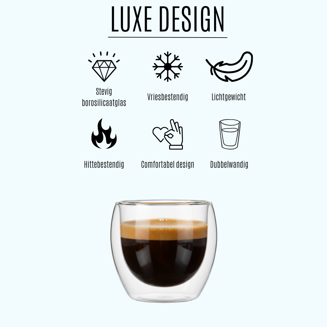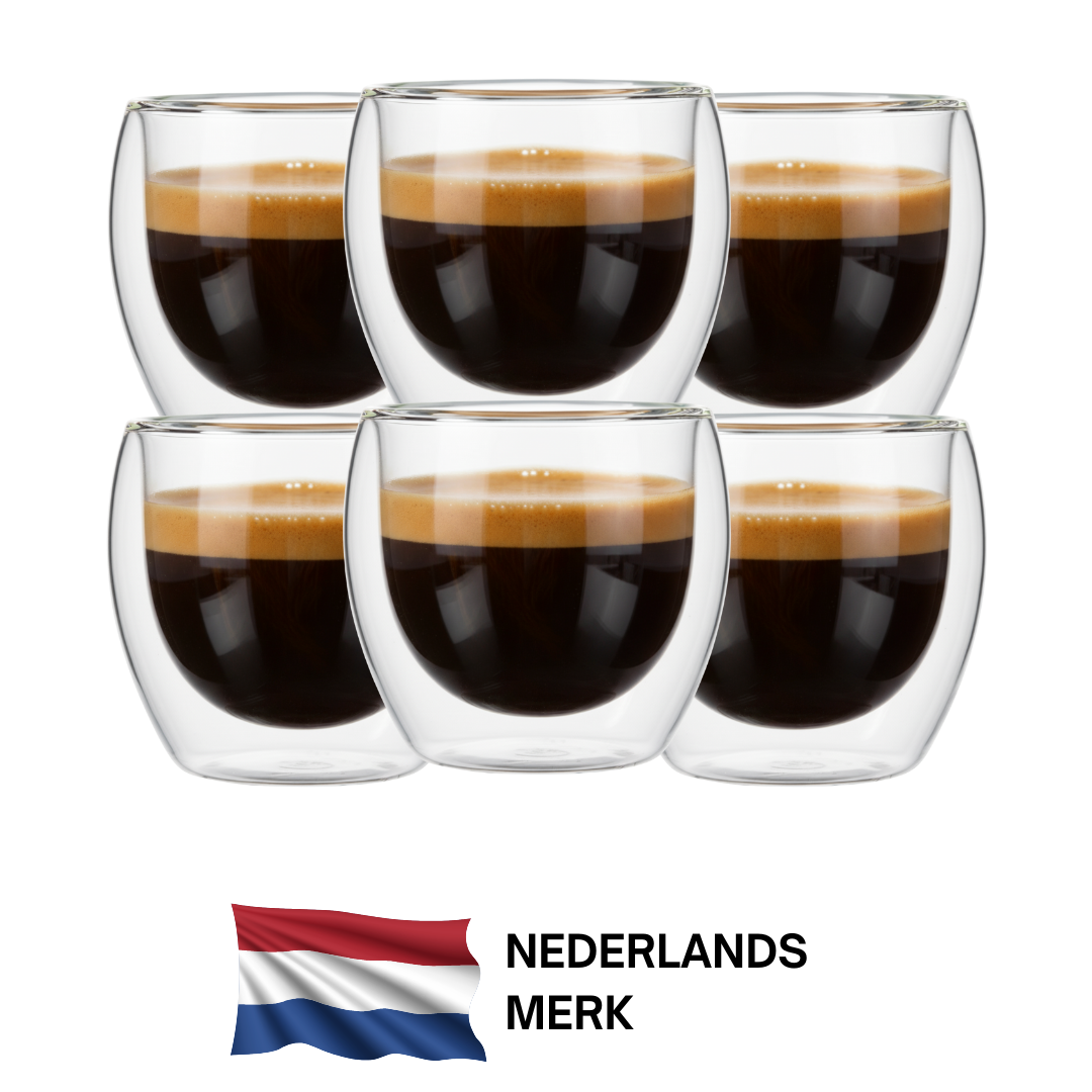 De dubbelwandige glazen zijn echt een gamechanger! Geen warme handen meer en mijn koffie blijft langer op temperatuur. Erg tevreden.